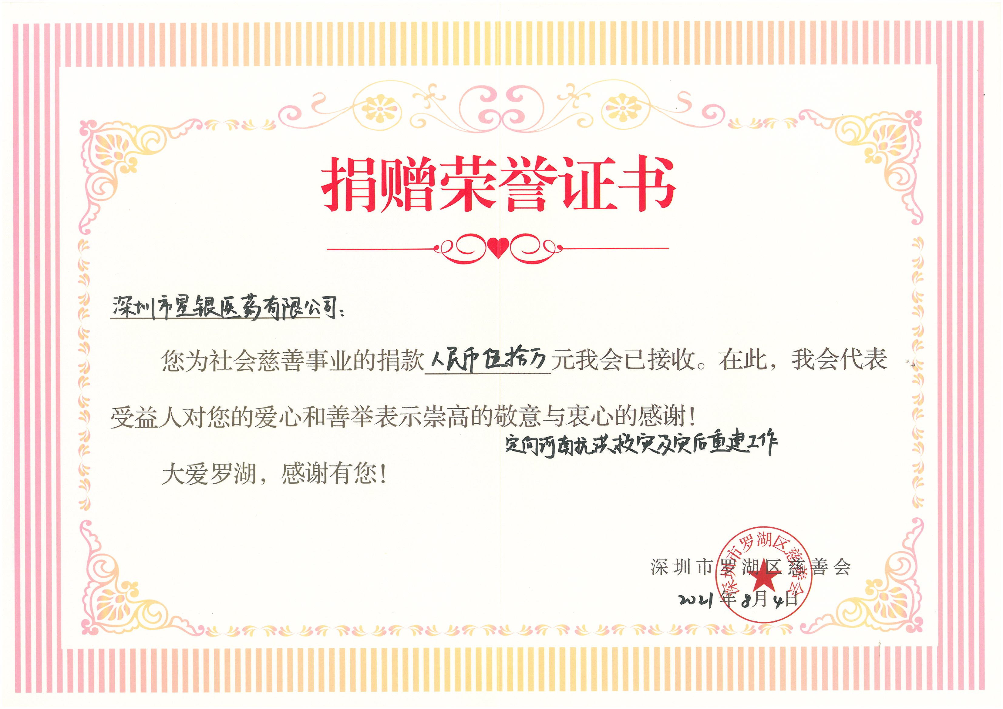 Xingyin Pharmaceutical donated 500,000 yuan in cash to support flood relief and post-disaster reconstruction in Henan Since July 17, many places in Henan have suffered extreme heavy rainfall and natural disasters such as waterlogging, mudslides and landslides caused by it, causing major casualties in the local area.